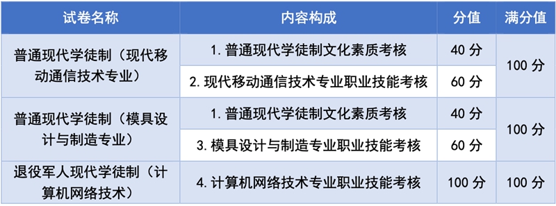 符合条件的退役军人报考退役军人现代学徒制专项计划免“文化素质”考核,由河源职业技术学院自主命题、组织实施“职业技能”考核,择优录取。河源职业技术学院按招生专业或专业大类组织命题,根据高职自主招生选拔性考试的特点,适当增加试题区分度。职业技能考核满分值100分。