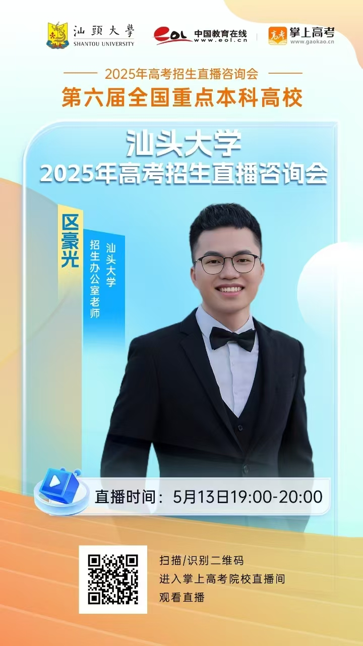 2025年高考大幕即将开启!志愿填报在即,你是否还在因这些关键问题而困扰?为方便考生和家长了解学校学科专业,汕头大学现参与中国教育在线·掌上高考于5月13日举办的“第六届全国重点本科高校2025年高考招生直播咨询会”活动,区豪光老师将与大家相约云端,畅谈学科发展,解读专业布局。