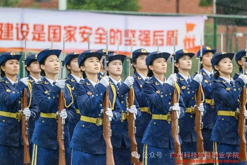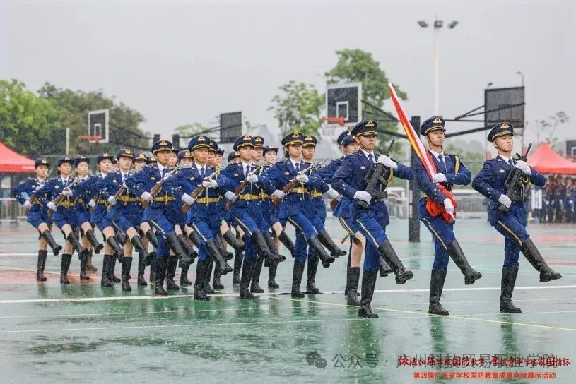 5月10日下午,大雨倾盆而下,广州科技贸易职业学院作为高职组第59位出场队伍,队员们闻战则喜、斗志昂扬,在如注的大雨中完成齐步行进、肩枪换端枪正步行进、端枪换肩枪齐步前进等队列动作,整齐划一的队列,气势如虹的精神面貌不仅征服了场上的裁判,让场下的观众也纷纷为他们点赞,最终学校国旗护卫队以468.02分拿下高校高职组升旗展示赛的“一等奖”!