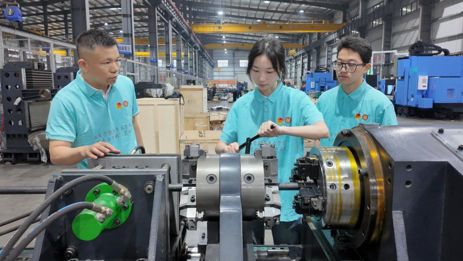 “我们的机床设备具有三大核心创新价值。”团队负责人戴丽蓝介绍,一是采用内外轴差速智能联动技术,通过工件旋转转化为对称刀具智能旋转切削,实现刀具周向、径向智能切削工件;二是采用大行程与拉力智能控制进给技术,创新性地采用同步液压驱动和 V 形滑轮对工件进行夹紧,通过进给电机智能驱动滑轮转动;三是采用智能工艺规程生成方法,对主轴转速等工艺大数据进行自学习,采用自决策算法生成合理的工艺规程。