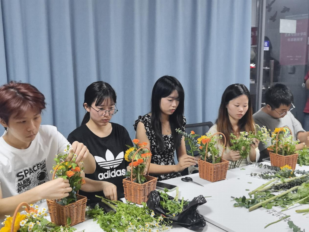 在该校南苑一站式社区内,该学院2024级辅导员裴林茹早早为同学们准备好鲜花、花泥、花艺剪刀等工具,带领学生们一起完成花艺作品,在学生们的奇思妙想和灵巧双手下,向日葵、洋桔梗、太阳花等纷纷被组合成花篮。看着自己的花艺作品,英语2302班鲁雨嫣笑着说:“我之前总觉得劳动是辛苦的,没想到简单的劳动也可以让人很放松,享受劳动的过程十分治愈。”