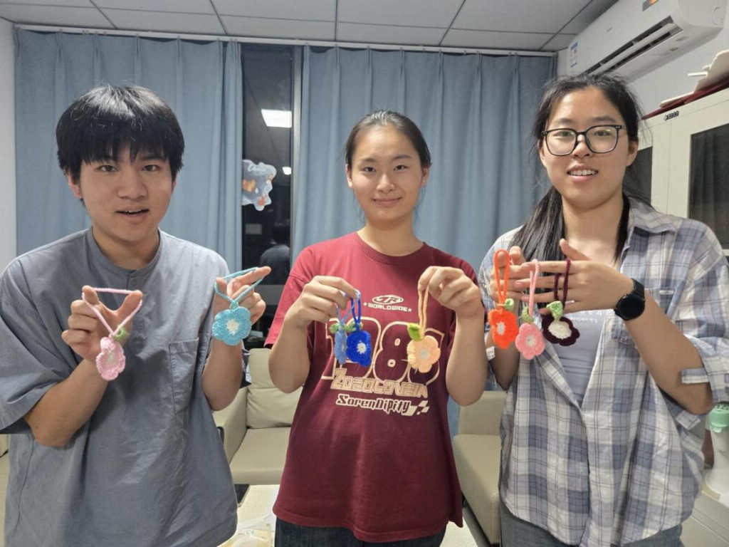 为了帮助学生们在劳动创造中塑造积极健康的心理状态,裴林茹带领学生们化身“织女”一起钩织手工花。“我们学院女生偏多,我想在劳动中为同学们增加一些趣味,吸引大家一起参与劳动。”学生们从学习简单的起立针、短针开始,在裴林茹的指导下,一步步根据钩织图解完成手工钩织花挂件,两小时后,学生们与同伴互相展示自己的劳动成果。