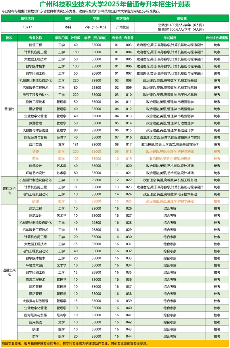 2025年,广州科技职业技术大学普通专升本招生专业涵盖了工学、管理学、文学、医学、艺术学、经济学等多个学科门类。前置专业要求:报考护理专业的考生,其专科专业需为护理或助产专业;其他专业无前置专业要求,满足学生个性发展的专业需求。