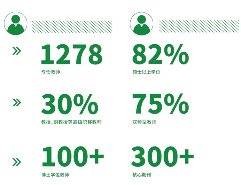 学校注重师资队伍建设。现有专任教师1278⼈,师⽣⽐1:15.41。正⾼职称教师114⼈,其中96⼈具有教授专业技术职称,副⾼职称教师274⼈,具有博⼠学位教师108⼈,硕⼠学位以上教师1047⼈,“双师型”教师754⼈,⾏业企业兼职教师 320⼈。省级教师团队1个,省级技能⼤师⼯作室2个,新增认定省级⾼层次技能型兼职教师8⼈。学校教师团队秉承"厚德博学、知行合一"的教育理念,以德立身、以行践诺,始终将培养新时代高素质应用型人才作为教育使命。