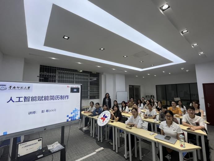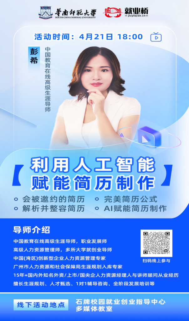 2025年4月21日,华南师范大学联合就业桥平台成功举办"AI赋能就业指导"专题讲座。本次讲座特邀中国教育在线生涯规划导师、资深人力资源专家彭希担任主讲,就《人工智能在简历制作中的应用策略》进行专业分享,旨在提升毕业生求职竞争力。