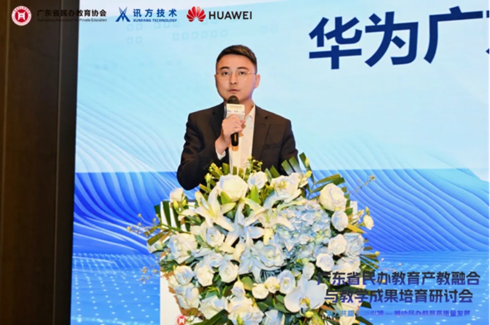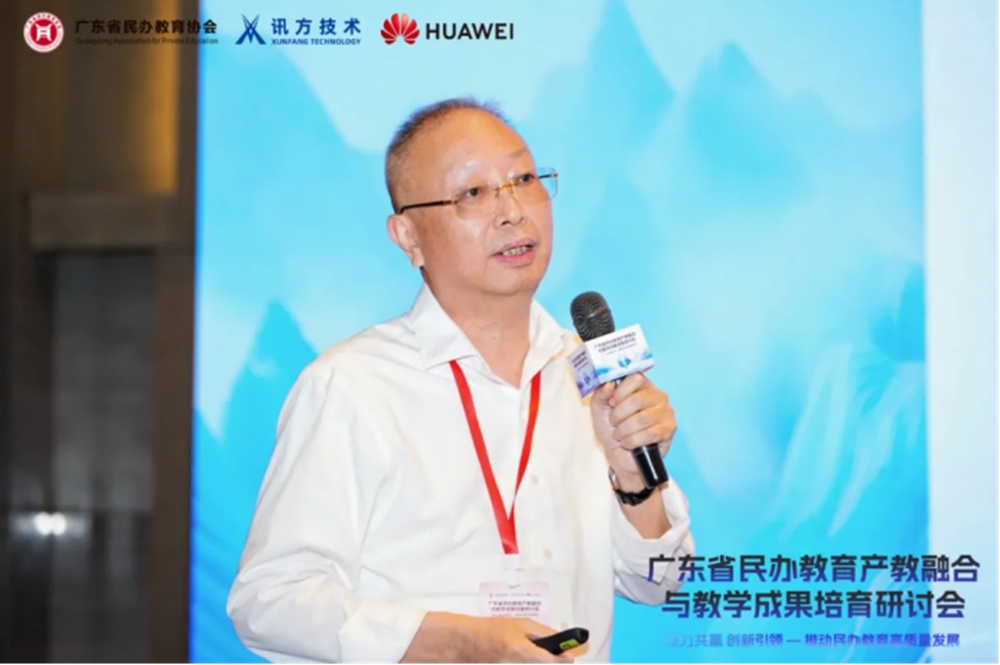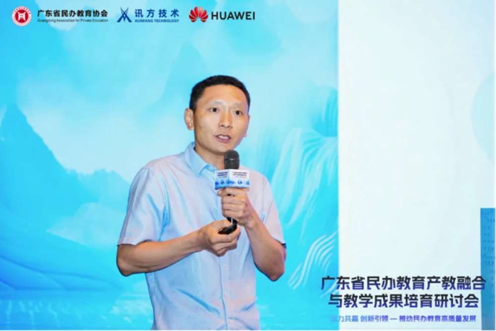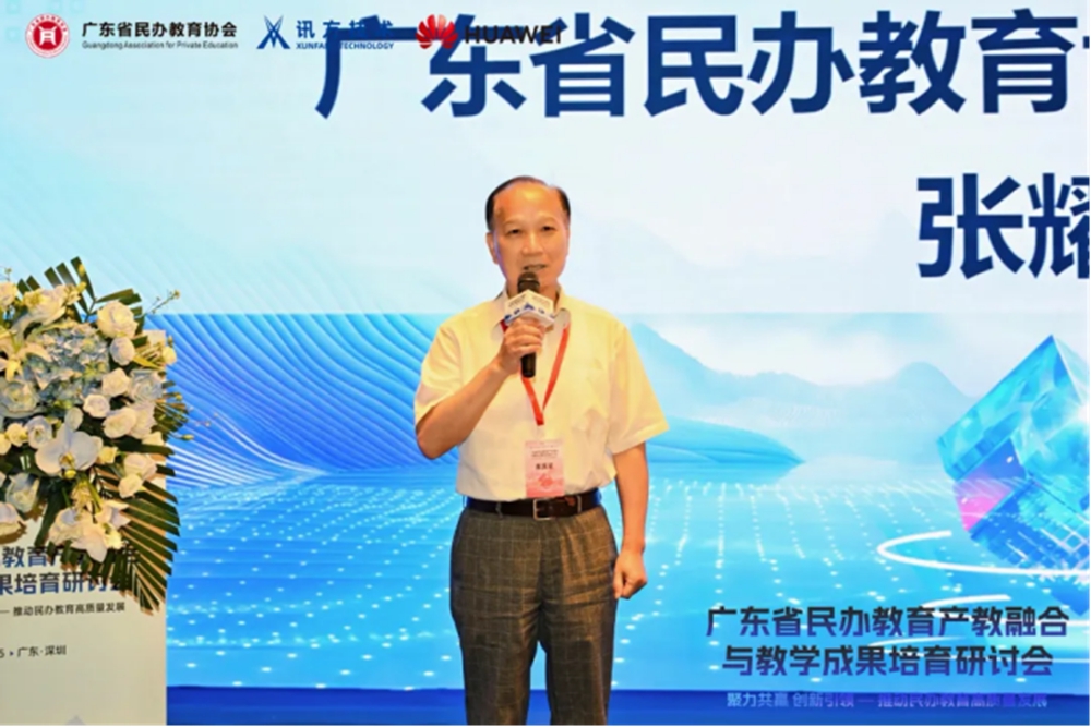 广东省民办教育协会常务副会长张耀荣致辞。他希望民办学校进一步落实《粤港澳大湾区发展规划纲要》和《教育强国建设规划纲要》,加强与华为和讯方公司的合作,共同打造产教融合的职业教育体系,构建人才培养、科学研究和技术转移为一体的产教融合科教融汇的“湾区样本”。