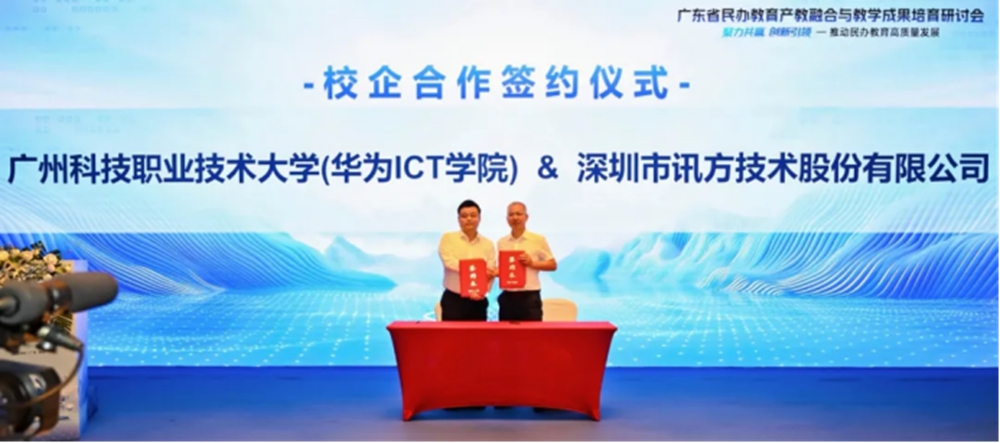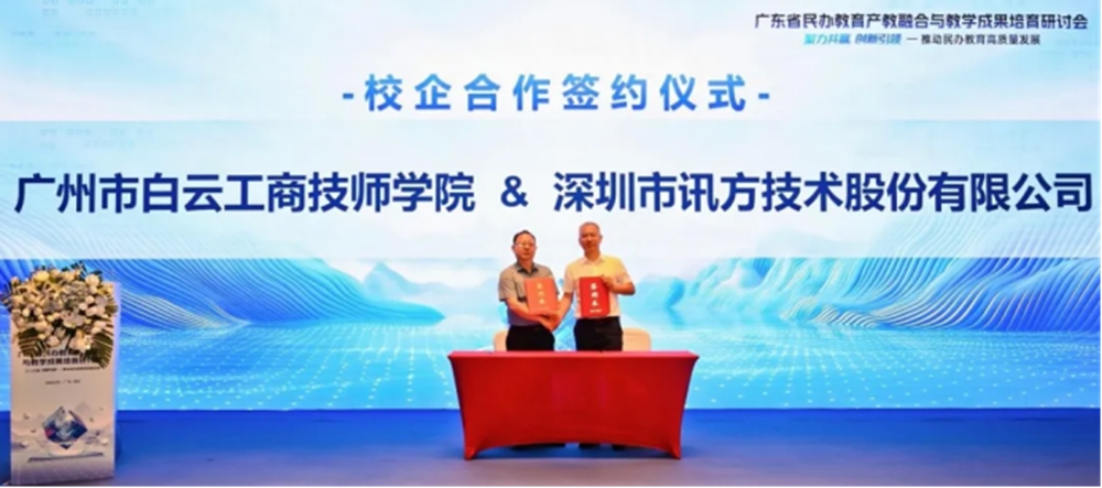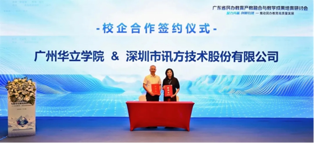 在广东省民办教育协会会长赵康、讯方技术董事长戴毅和与会代表见证下,广东省民办教育协会常务副会长张耀荣和讯方技术总裁刘国锋签署了战略合作协议。讯方技术与广州华立学院、广州科技职业技术大学、广州市白云工商技师学院签署了校企合作协议。