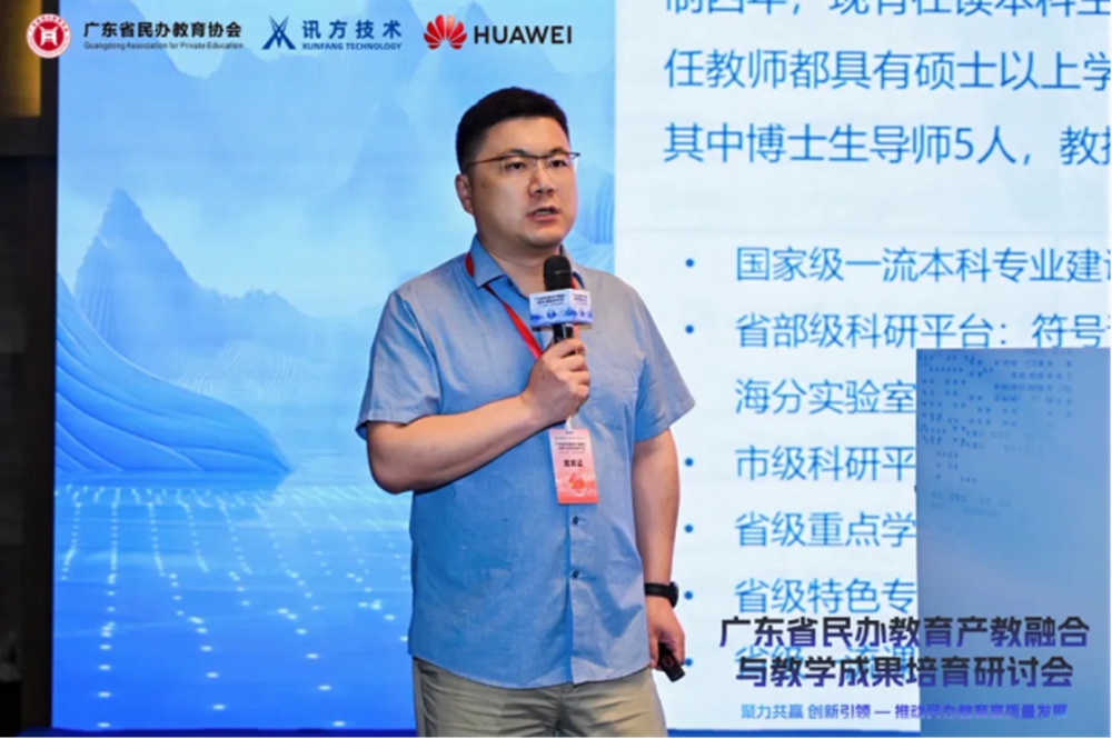 广东理工学院电气与电子工程学院院长倪元相以《产教深融合·数智育新人—广东理工学院创新实践之路》为题发言。他从学校概况、全光网校园、华为ICT学院、微专业建设、未来规划等方面介绍了学院在深化校企协同育人、推动教育数字化转型以及创新人才培养模式等方面的成果。