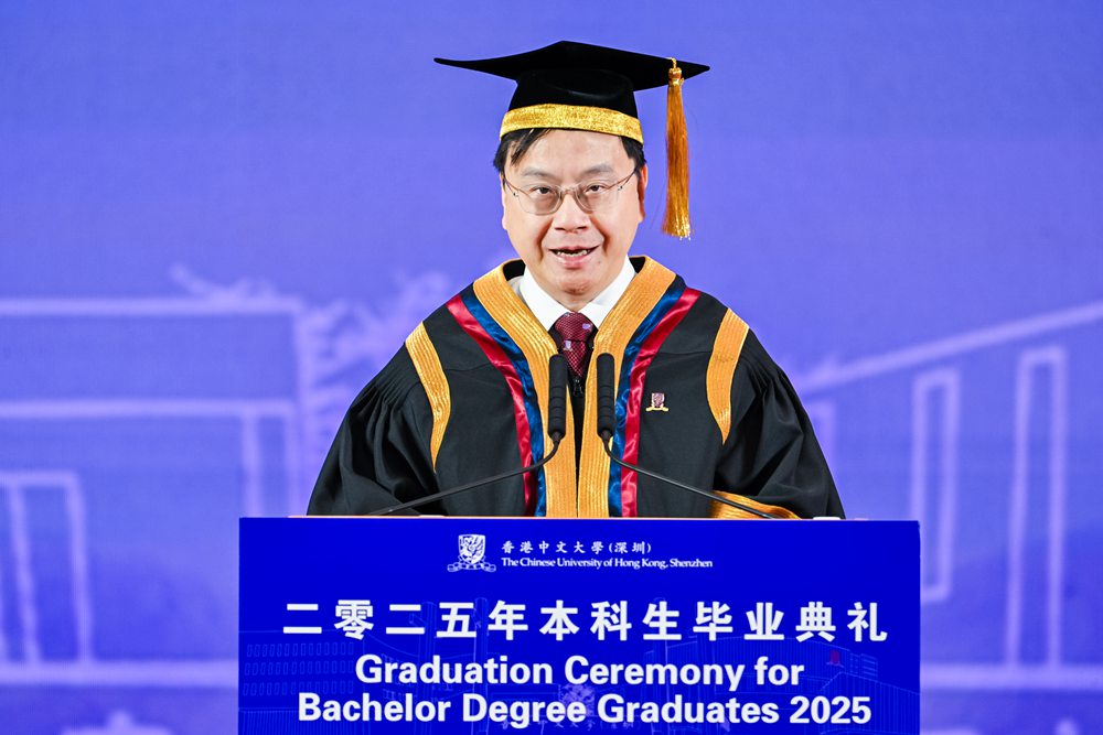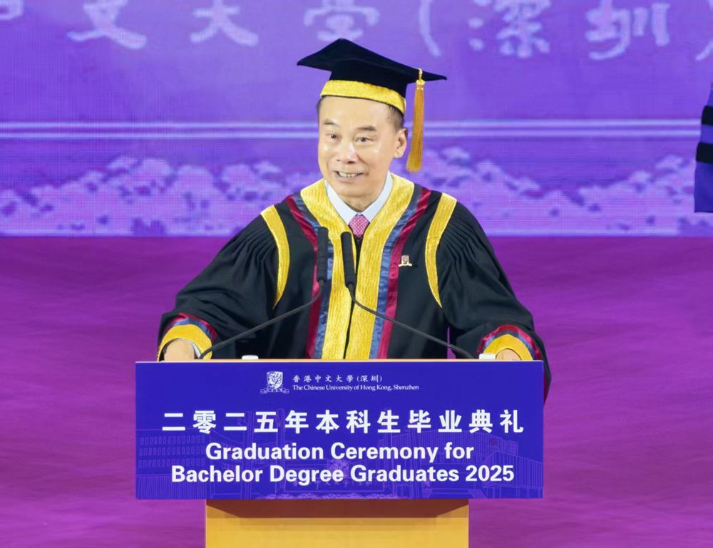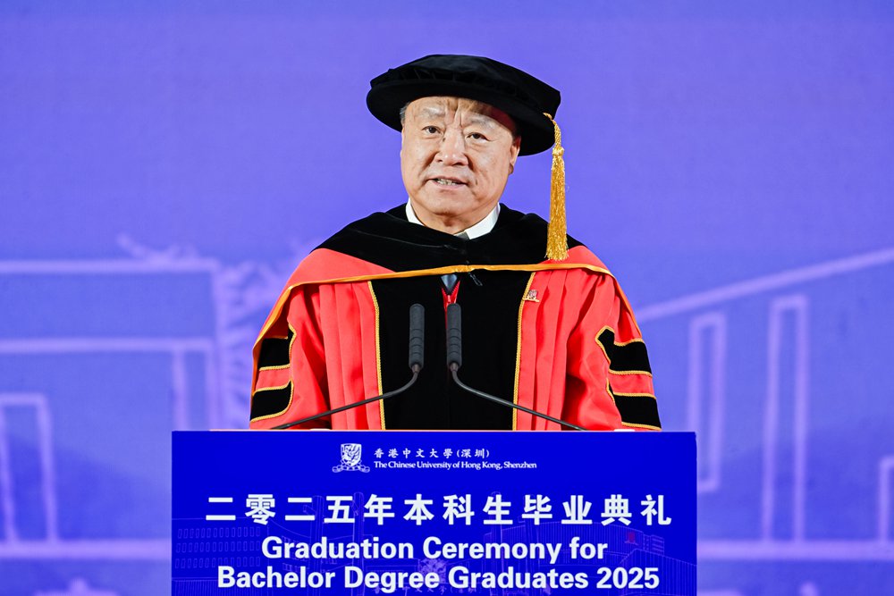 面对复杂多变的世界,卢煜明教授提醒毕业生们要以批判性思维和清晰的目标应对技术进步带来的新挑战。他鼓励同学们铭记“博文约礼”的校训,“既要常怀谦卑之心,在他人需要时伸手相助、服务他人;也要心怀天下,始终思考如何为社会、国家乃至全人类的福祉而努力。作为世界公民,请胸怀寰宇,立足当下,因为在改变世界的征程中,跬步可至千里,涓滴能汇江海。终有一日你们会发现,港中大(深圳)的教育已赋予你们勇立潮头、行稳致远的坚实底气。” 卢煜明教授引用“千里之行,始于足下”的名言鼓励同学们勇敢走出舒适区,探索未知的广阔天地,战胜内心的彷徨恐惧,拥抱终身学习的精神。