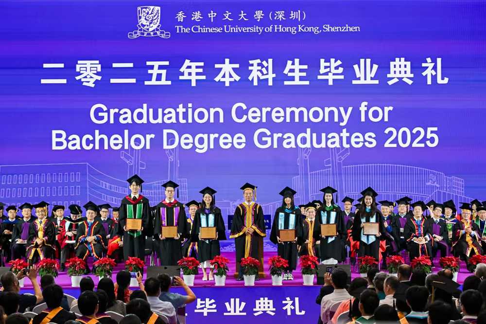 2025年,共有18位毕业生荣获“大学杰出学生奖”,他们在大学期间表现优异,展现出卓越的学术能力、领导力以及对学校发展作出重要贡献,用实际行动诠释了青春的责任与担当。香港中文大学校董会主席查逸超教授,香港中文大学(深圳)理事长、香港中文大学校长卢煜明教授和香港中文大学(深圳)校长徐扬生教授为他们颁发了奖状并合影留念,获奖学生分别是:陈尚石(思廷书院、数据科学学院)、陈思燕(祥波书院、经管学院)、冯晓琳 (逸夫书院、音乐学院)、ZOE MANUEL HALIM(道扬书院、数据科学学院)、黄麒桦(思廷书院、人文社科学院)、李芳仪(逸夫书院、经管学院)、潘一琪(逸夫书院、经管学院)、任喆程(思廷书院、数据科学学院)、谭芷韵(逸夫书院、经管学院)、吴昶成(思廷书院、经管学院)、夏禹扬(逸夫书院、数据科学学院)、徐源 (逸夫书院、数据科学学院)、徐艺凌(学勤书院、经管学院)、杨萱楠(学勤书院、人文社科学院)、叶遥(学勤书院、经管学院)、周凯怡(学勤书院、医学院)、周诗璟(逸夫书院、理工学院)、朱新源(思廷书院、理工学院)。