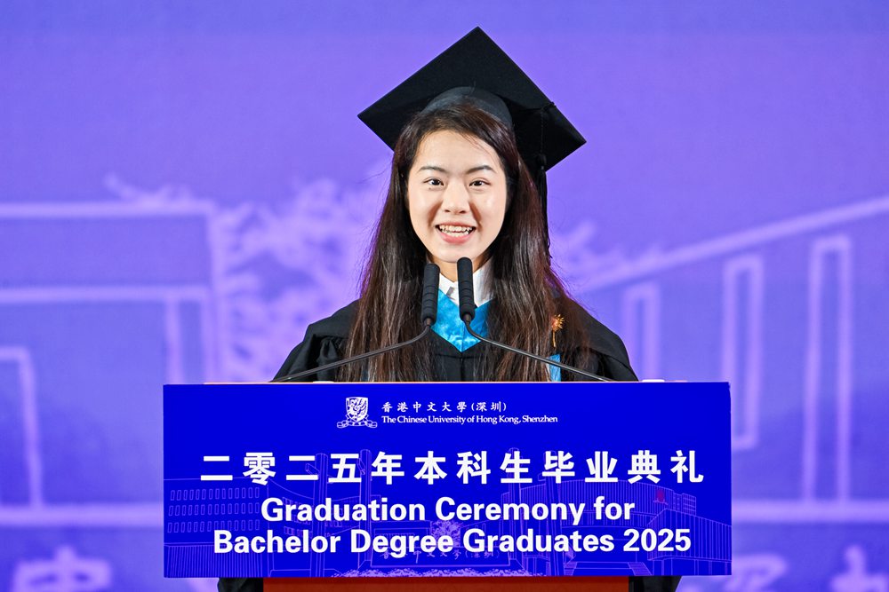 来自学勤书院、经管学院的毕业生徐艺凌作为毕业生代表发表了感言。她分享了在港中大(深圳)四年求学时光里沉淀下来的三点体悟:追逐热爱,认清边界,结伴同行。“首先,我找到了热爱。无论是破解商业难题、投身社会公益,还是站在聚光灯下演绎角色,我都找到了心之所向。这份自由探索的勇气与追逐热爱的底气,正是港中大(深圳)赠予我最珍贵的礼物。第二,我学会了认清边界。向内审视,边界能助我明晰自身优劣;向外求索,边界为我指明了突破的方向。第三,我遇见了我的同行者。在港中大(深圳),我结交了许多推心置腹的挚友。他们激励我前行,鞭策我成长,也始终是我最坚实的后盾。”