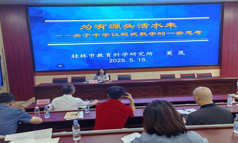 随后,由桂林市教育科学研究所高中政治教研员莫岚老师做专题发言,并以“为有源头活水来——关于中学议题式教学的一些思考”为题,就议题式教学提了有效建议,从基于学情选定教学目标、依据课标设计教学议题、遵循“三贴近”原则选取教学情境以及从四维角度构思“山水思政”建设。