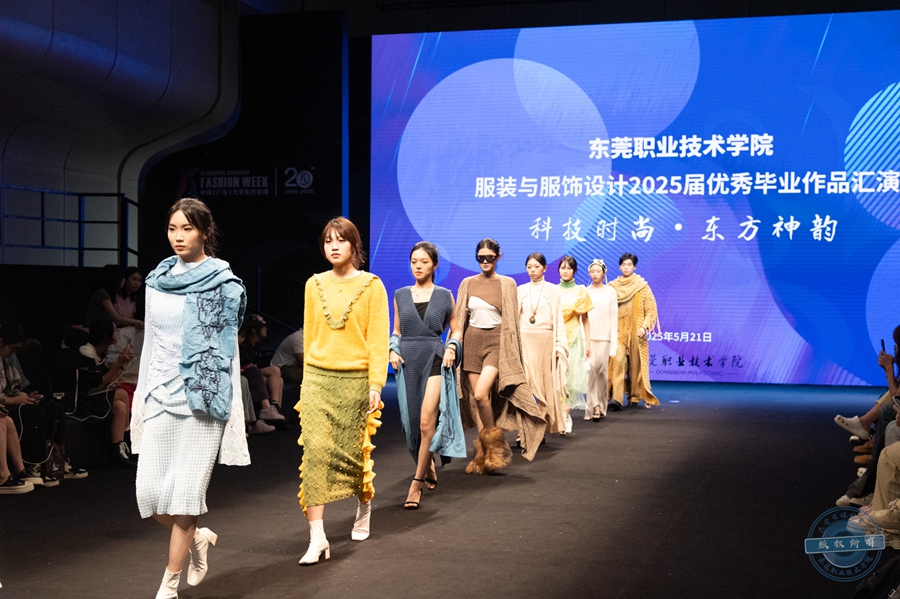 5月21日,广东省大学生时装周在广州轻纺城开幕,吸引了省内27所院校积极参与。东莞职业技术学院服装与服饰设计专业的师生们以“科技时尚,东方神韵”为主题,从94名毕业生的优秀作品中精心筛选出20个极具创意与文化底蕴的设计作品精彩亮相,成为本次时装周的一大亮点。