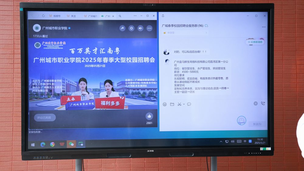 本场招聘会最大的亮点是首次在学校官方微信视频号上同步进行线上直播带岗,本校培养的人力资源管理专业的学生,将企业的岗位和需求“云推送”给无法来现场参加招聘会的应届毕业生和往届毕业生,惠及更多有就业或转岗需求的学生。来直播间观看直播的人数最高达到5139人,点赞2.0万次。