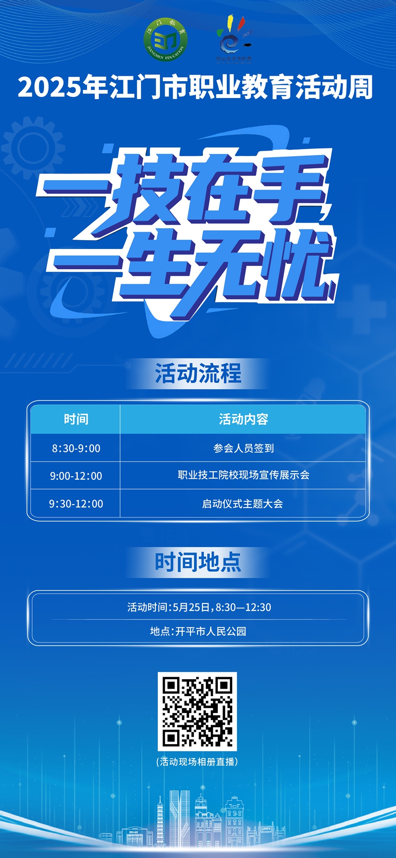 2025年5月25日,江门市职业教育活动周启动仪式将在开平市人民公园隆重举行。本次活动以“一技在手 一生无忧”为主题,通过丰富多彩的技能展示、颁奖授牌和产教融合成果发布,展现江门职业教育的蓬勃生机与创新活力。