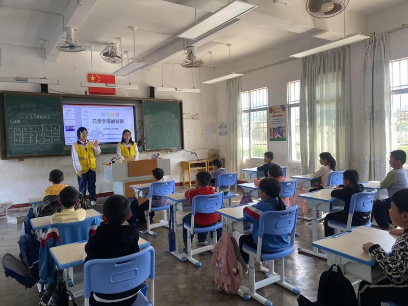 针对乡村英语教育存在的师资短缺、资源匮乏、兴趣不足等痛点,学院创新推出“语言+文化+实践”三位一体帮扶方案。每周两次的送教活动中,师生志愿者们运用自然拼读法设计趣味课堂,将数字化教学资源与传统授课相结合,开发出《英美文化趣谈》《英语绘本创作》等特色课程。