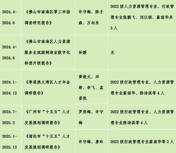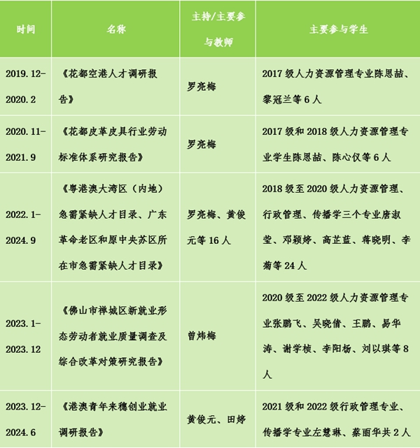 在专家团队的指导以及专业教师的带领下,公共治理学院学生积极学以致用。例如,2018级至2020级以人力资源管理、行政管理、传播学三个专业为主的24名同学带动了100余名同学完成对“粤港澳大湾区急需紧缺人才”调研原始数据的收集与初步清洗。学生团队通过统一数据格式、处理缺失值、异常值和错误数据等,为教师团队的数据分析奠定了可靠基础;2021级学生吴晓倩、张鹏飞、王鹏等8名同学在佛山市禅城区新业态调研中提出“灵活就业者权益保障分级方案”,被纳入政府政策优化建议;2022级学生蔡丽华、陈诗淇等在“零工市场调查”“人才现状调查”中积极发放与收集问卷、记录访谈内容等,采集200余份用工数据,为后续的调研处理提供了翔实的资料。学生在数据处理、政策建言等实践中逐步成长为“懂产业、会诊断、能献策”的应用型人才。