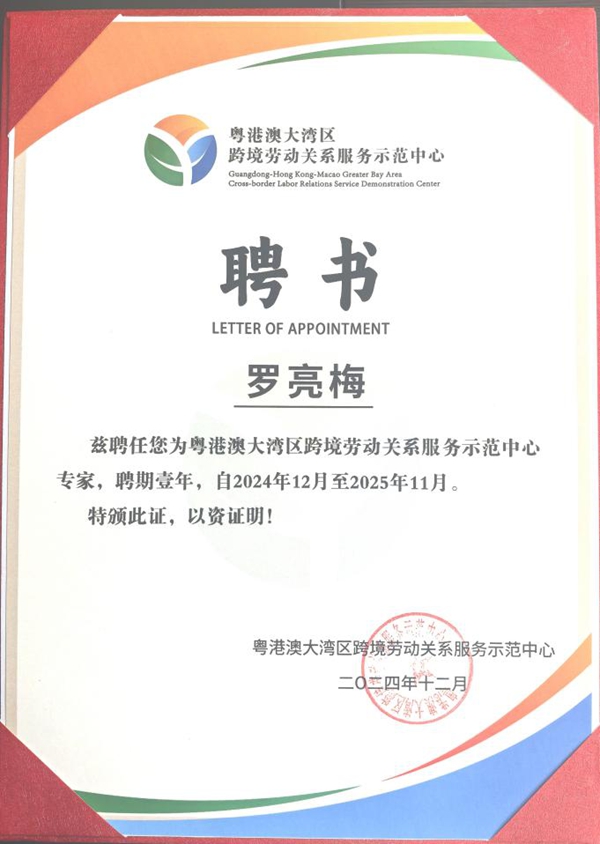 罗亮梅获聘“粤港澳大湾区跨境劳动关系服务示范中心专家”
