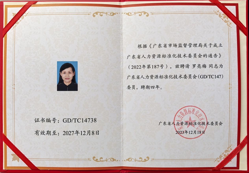 罗亮梅获聘“广东省人力资源标准化技术委员会”委员