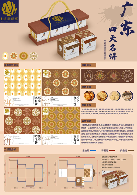 在近日举办的首届“锦华杯”湾区烘焙食品包装设计大赛中,广州新华学院2023级艺术设计学专业林祺越同学凭借作品《广东四大名饼》荣获大赛金奖,廖梓淇同学以作品《老师傅指尖揉进潮州时光——腐乳饼》摘得铜奖(指导教师刘扬),充分展现了我学校在创新设计领域的教学成果与学生的卓越才华。