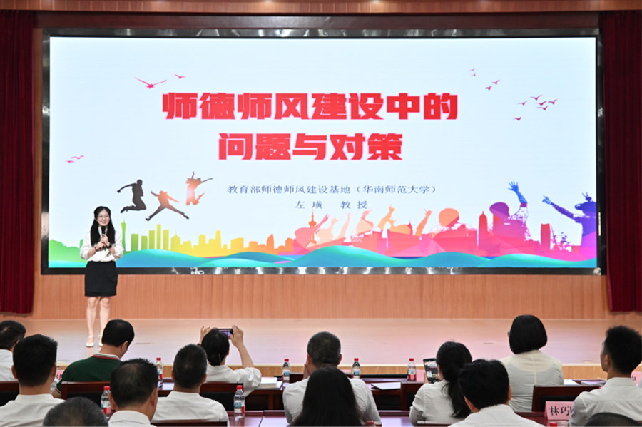 华南师范大学左璜教授作《师德师风建设中的问题与对策》专题报告,她强调,新时代师德建设需从单点思维转向系统思维,以核心素养为导向重构好老师内涵。她提出通过溯源教育目的、创新培育方法、改革评价机制,构建“爱自己 — 爱他人 — 爱社会”的养成链条,推动师德建设与教育改革同频共振。