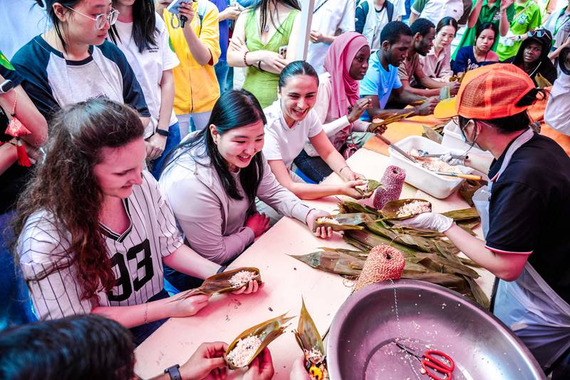 来自塔吉克斯坦的留学生王舒芳兴致十足地向记者展示了自己精心包好的粽子:“包粽子真不是一件简单的事!我觉得最难的一步是把叶子折起来。但对比起现买的粽子,自己做的让我更有成就感,我觉得这个过程很有意思!”一旁的俄罗斯留学生妮可附和道:“回国之后,我还会做给我的家人吃!”