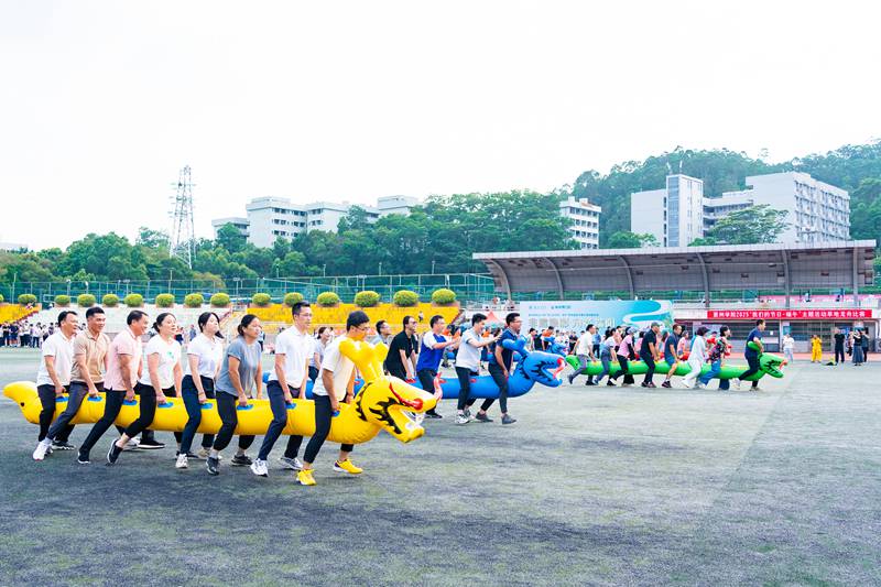 “加油!跟上节奏!”田径场上,“粽香龙腾迎端午”旱地龙舟赛将传统民俗赛龙舟转化为校园竞技。教工组15支队伍、学生组19支队伍同场竞技,随着赛场哨声响起,队员们步伐一致、奋力前行,龙舟如离弦之箭,气氛紧张而热烈。在队员们的呐喊声中,“团结奋进”的传统文化精神与“力争上游”的现代体育精神同频共振。这场“没有江水的龙舟赛”,却在师生心中激起了更澎湃的文化涟漪,为校园文化建设注入全新活力与深刻内涵。
