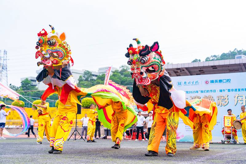 活动现场,三组非遗项目的创新演绎成为“文化对话”的生动注脚。惠州李家拳传承人欧阳粤强携学生与民乐团共演《弦鼓承拳韵》,刚劲拳风与古筝流韵、大鼓铿锵激烈碰撞,将“南拳北腿”的武术精神与“以乐载道”的传统美学熔于一炉;客家山歌传承人林秀花与惠州学院音乐学院师生创作的《新韵悠扬歌情长》,以“岭南山歌”的婉转乡音为底,融入流行音乐的节奏编排,让省级非遗在青春校园里“唱”出时代新声;惠阳沙田东澳麒麟队与体育学院学生带来的《祥麟瑞龙贺端午》,麒麟腾跃、彩龙翻卷,将“驱邪纳福”的民俗意象与“和合共生”的文化内核娓娓道来,赢得现场掌声如潮。