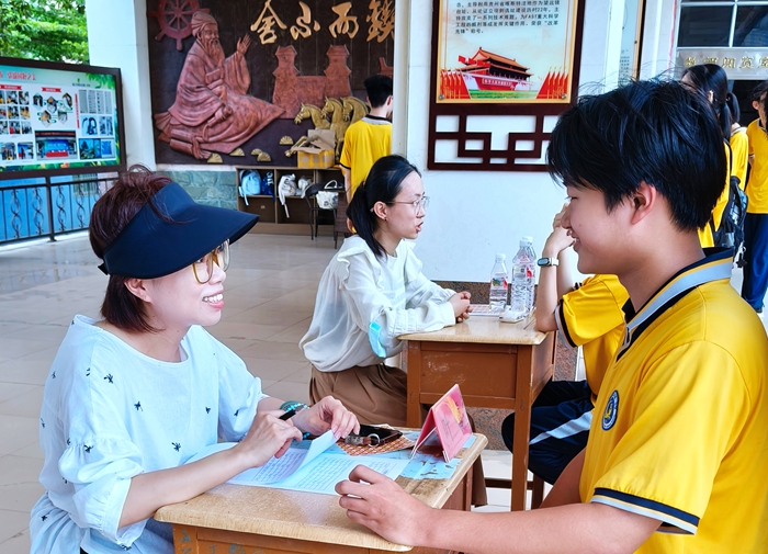 活动现场有一方天地与众不同——在大厅中央坐着广东医科大学的心理老师,叶馨老师与陈欣琳老师耐心地倾听每位同学的问题,温和地提供建议和方法,为迷茫、焦虑的高三学生拨开心里的迷雾。高三学生心理问题主要集中在考试焦虑、学习压力、睡眠障碍等方面,叶老师和陈老师在现场一对一地解答,并传授一些简易可行的减压小技巧。