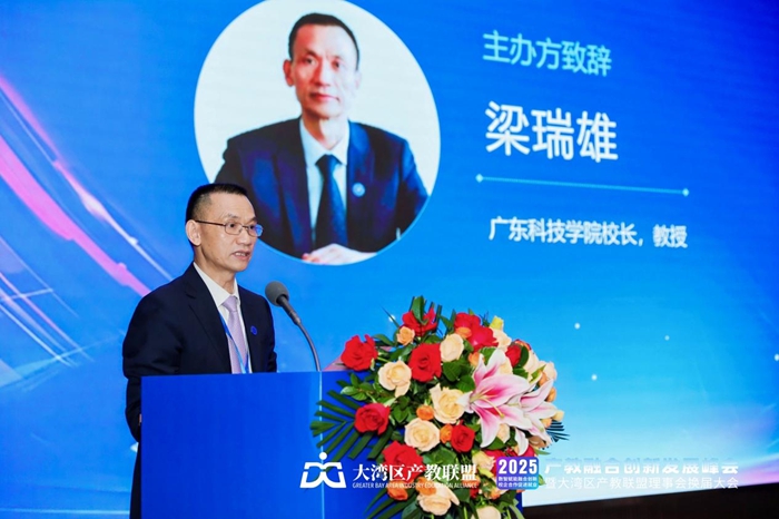 广东科技学院校长梁瑞雄致辞。他代表广东科技学院全体师生,向出席本次大会的各位领导、专家、嘉宾表示热烈的欢迎,向辛勤筹备本次大会的工作人员表示诚挚的感谢,并介绍了学校建设及产教融合发展情况。他强调,作为大湾区产教联盟发起单位,广东科技学院愿与社会各界携手共进,深化数智赋能、扩大开放协同,为推动大湾区产教融合高质量发展做出更大的贡献!