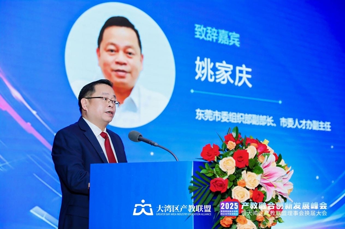 东莞市委组织部副部长、市委人才办副主任姚家庆表示,此次峰会将为东莞高质量发展注入新动力,有力推动东莞乃至大湾区的产教融合发展。他在致辞中提出几点期望:一是希望专家学者围绕产教融合热点、难点问题建言献策,提供智力支持;二是希望企业代表发挥优势,加强校企合作,打造产教融合新模式、新典范;三是希望大湾区产教联盟发挥桥梁纽带作用,推动资源共享、优势互补 。