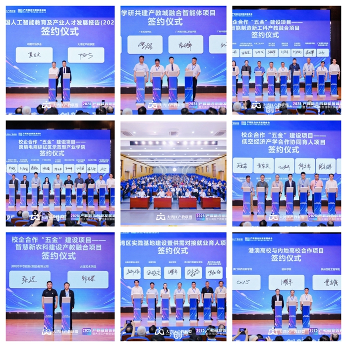 大会还举办了大湾区产教联盟与中国市场学会《中国人工智能教育及产业人才发展报告(2025)》项目、与广东工业大学东莞华南设计创新院产教城融合智能体项目、校企合作“五金”建设项目、大湾区实践基地建设暨供需对接就业育人项目、“双千计划”合作项目、澳门中西创新学院与内地高校合作项目签约仪式。这些项目凝聚了政校行企四方的智慧与期待,标志着产教融合迈向更深层次的实践。