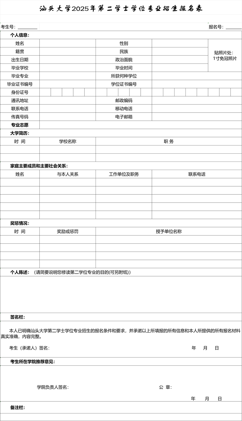 附件:汕头大学2025年第二学士学位专业招生报名表