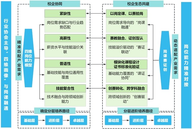 通过行业协会主导的“四维岗位画像”即紧缺性、高薪性、普适性、技能复合性,精准对接AI直播运营师、跨境电商数据分析师等岗位需求,重构“AI技术+电商运营”模块化课程体系,并引入企业真实项目库、电商沙盘、数字人直播实训平台、国产AI模型智能体。同时,建立“双师型”师资团队,校企共建资源和师资,以“三师合力”打造工匠工坊,通过“AI四元多维”动态评价体系,确保人才培养与产业需求同频。