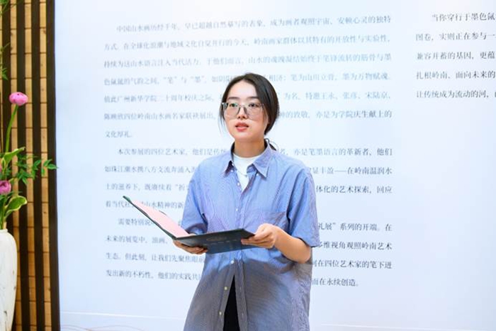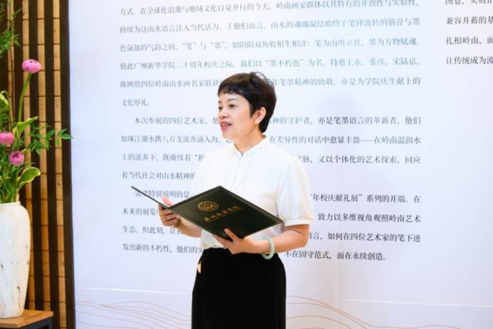 开幕式上,学校校长助理蔡映辉致辞。她表示,“墨不朽也”画展是一场跨越时空的文化对话,画家们以笔墨为舟,将千年文化精神的脉络重新串联,为现代人提供灵魂的栖息之所。蔡映辉强调,广州新华学院一直始终秉持“以美育人、以文化人”的理念,希望通过此次高水准的画展,让同学们浸润在传统艺术之中,汲取文化力量,铸就坚韧精神,从容面对生活。