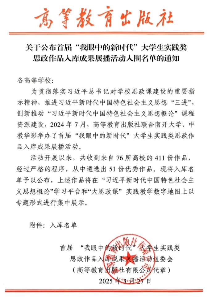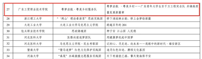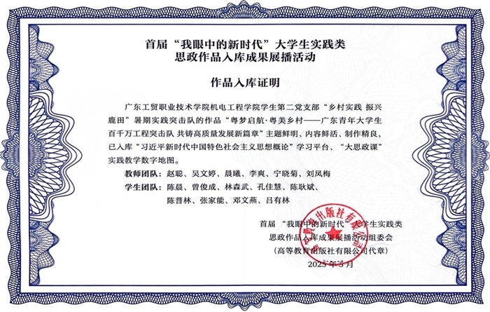 本次活动于2024年7月启动,活动开展以来,共收到来自76所高校的411份作品,经过严格的程序,从中遴选出51份优秀作品。广东工贸职业技术学院机电工程学院教师吴文婷,马克思主义学院教师赵聪、晨曦、李爽、宁晓菊、刘凤梅等指导老师团队,指导22级电气自动化专业学生陈晨、曾俊成、林森武等、22级人力资源管理专业孔佳慧等,学生作品“粤梦启航·粤美乡村--广东青年大学生百千万工程突击队共铸高质量发展新章”主题鲜明、内容鲜活、制作精良,成功入库“习近平新时代中国特色社会主义思想概论”学习平台、“大思政课实践教学数字地图。