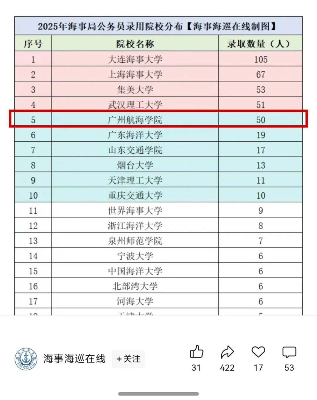 交通运输部人事教育司日前发布消息,2025年度交通运输部海事局公务员拟录用杨芃铭等708人。广州航海学院作为航海特色本科院校,考取人数达50人,位居全国第五、广东第一,其中本科生考取人数位列全国第三。在全国招录总量同比缩减的背景下,该校录取人数较去年30人增长66.7%,展现出强劲的人才培养实力。