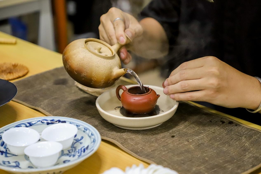 冲茶时,吴嘉鑫展示了“关公巡城”和“韩信点兵”两个经典动作。只见茶壶流畅移动,茶汤像小溪一样均匀地注入三个杯子。这两式保证了每杯茶的浓淡、香气和分量都一模一样,体现了公平对待的精神。