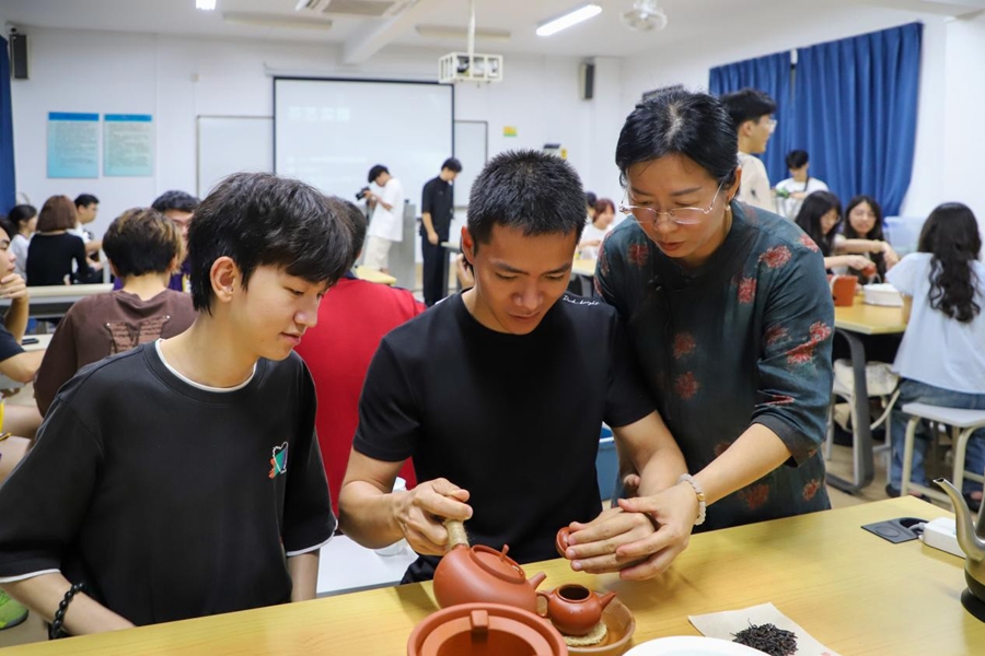 国家级非物质文化遗产项目“潮州工夫茶艺”日前“焕新”走进广东外语外贸大学南国商学院课堂。该校创新美育实践,特邀潮州工夫茶艺代表性传承人吴嘉鑫联袂校内教师,通过方言解码、经典“二十一式”展演与Z世代互动设计,生动解锁茶艺蕴含的“文化美、乐理美、画面美、创新美”,让师生在沉浸式体验中零距离感受传统技艺的当代活力。