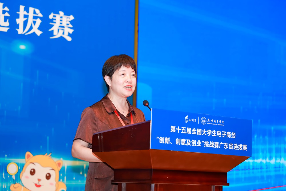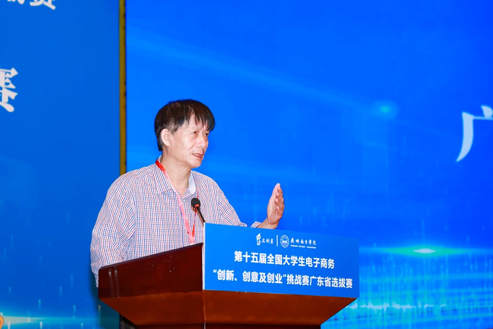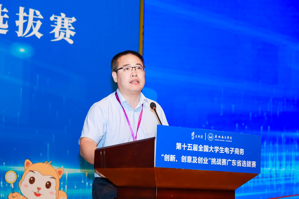 第十五届广东省三创赛竞赛组织委员会主任、广东省本科高校电子商务类专业教学指导委员会主任委员、华南师范大学邓顺国教授致辞。他指出,本次广东赛区的赛事与往届相比有了很大的进步,也有了很多新的特点,科技含量更高,实用性更强。他表示,本次广东省选拔赛将有利于推动广东省高校电子商务和跨境电子商务专业的建设,以赛促教、以赛促学,助力学校教育事业高质量发展,对各高校培养符合粤港澳大湾区社会需求的电商人才起到积极的作用。