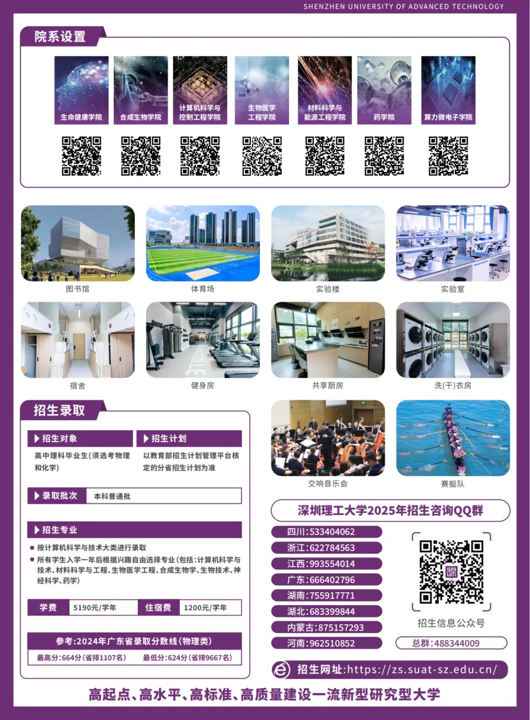 深圳理工大学刚一成立,就以独特的人才培养模式吸引了考生与家长的广泛关注和认可。2024年在广东省招收首届本科生,获得了非常优质的生源:录取了物理类考生120人,最高分664分(省排1107),最低分624分(省排9667),最低分超本科线182分。