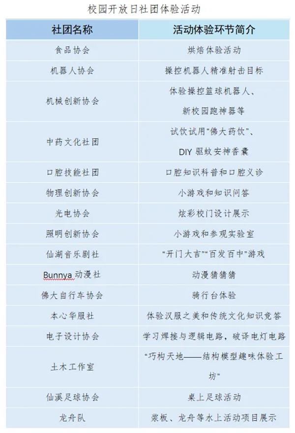 社团风采大秀场:在北区宿舍校园文化展示区,各大学生社团精彩亮相!动手体验手工艺制作、参与趣味体育游戏和活力四射的学长学姐聊聊天,还可以观看龙舟、桨板水上竞速,提前感受丰富多彩的校园生活。