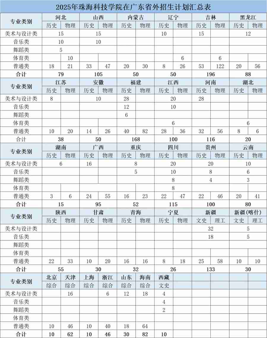 ▲2025年珠海科技学院在广东省外招生计划汇总表