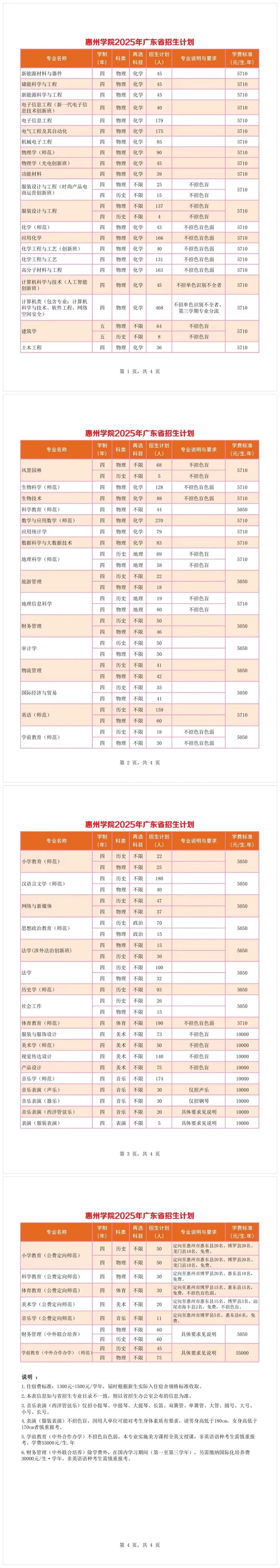 1.2025年,惠州学院广东省内招生计划:普通类(物理)计划3665人;普通类(历史)计划1218人;美术类计划358人;音乐类计划265人;体育类计划220人;表演类计划5人。其中教师专项(公费定向)培养招生计划191人(含小学教育专业100人、科学教育专业30人、体育教育专业30人、音乐学专业11人、美术学专业20人)。