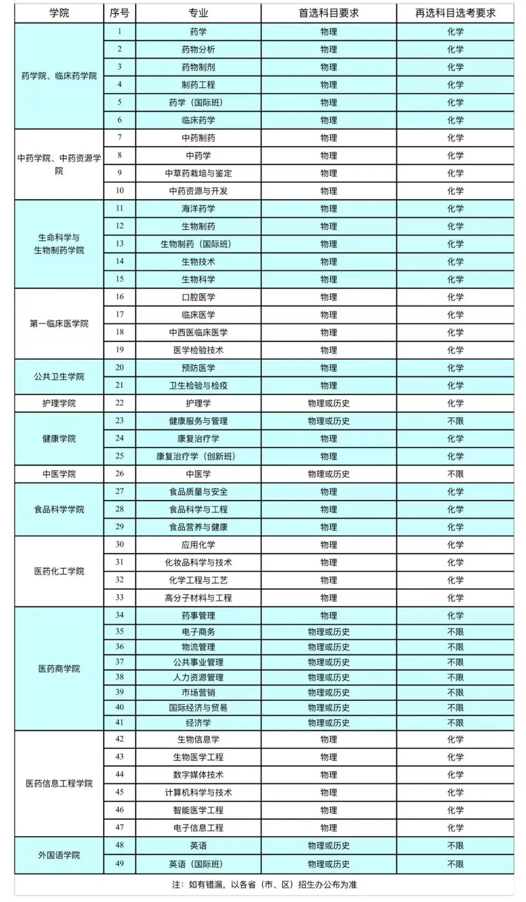 广东药科大学2025年夏季普通高考各专业选考科目(“3+1+2”模式)