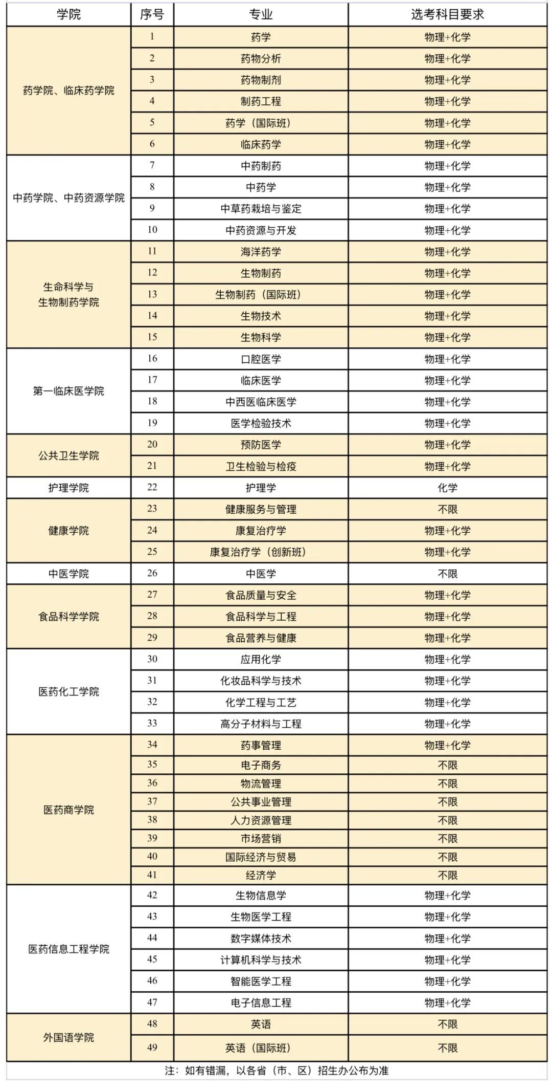广东药科大学2025年夏季普通高考各专业选考科目(“3+3”模式)