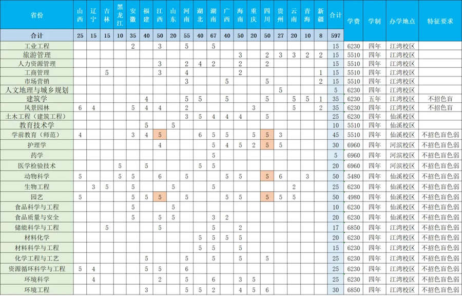 3.江西省的学前教育(师范)、园艺,四川省的学前教育(师范)、园艺、护理学、动物科学专业为国家专项计划(表格中橙色高亮处)。
