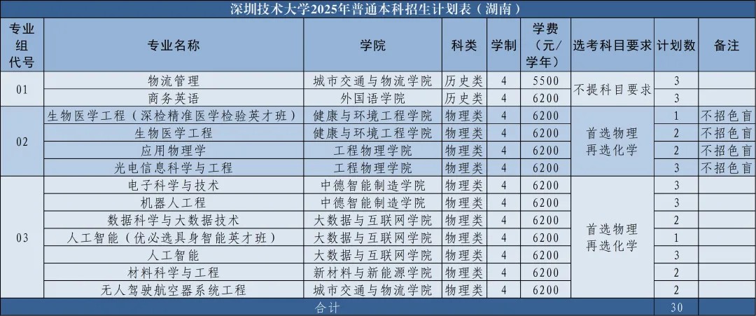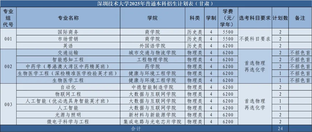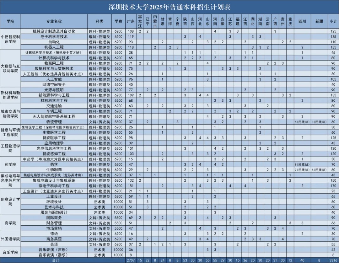 深圳技术大学2025年计划面向广东、黑龙江、辽宁、内蒙古、甘肃、青海、宁夏、陕西、山西、河北、山东、河南、安徽、江苏、福建、江西、湖北、湖南、云南、广西、贵州、重庆、四川、新疆等24个省份招生,计划招生3350人。
