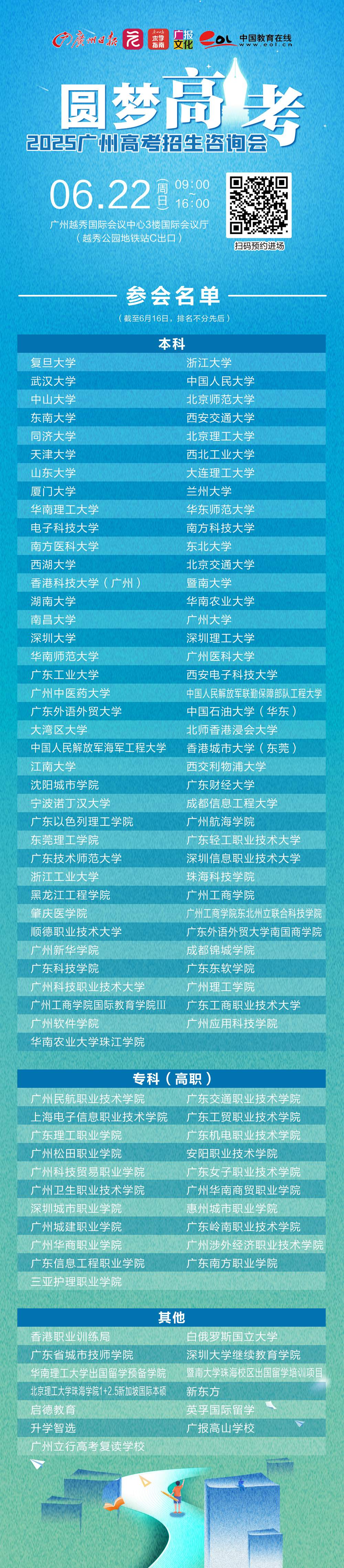 为回应社会需求,由广州日报报业集团(广州日报社)主办,广州日报社健康教育新闻部、广州广报文化发展有限公司、中国教育在线联合承办的2025年广州高考招生咨询会将于6月22日9时—16时在广州越秀国际会议中心举行。超100所省内外好大学准时集结,公益助力科学填报高考志愿。