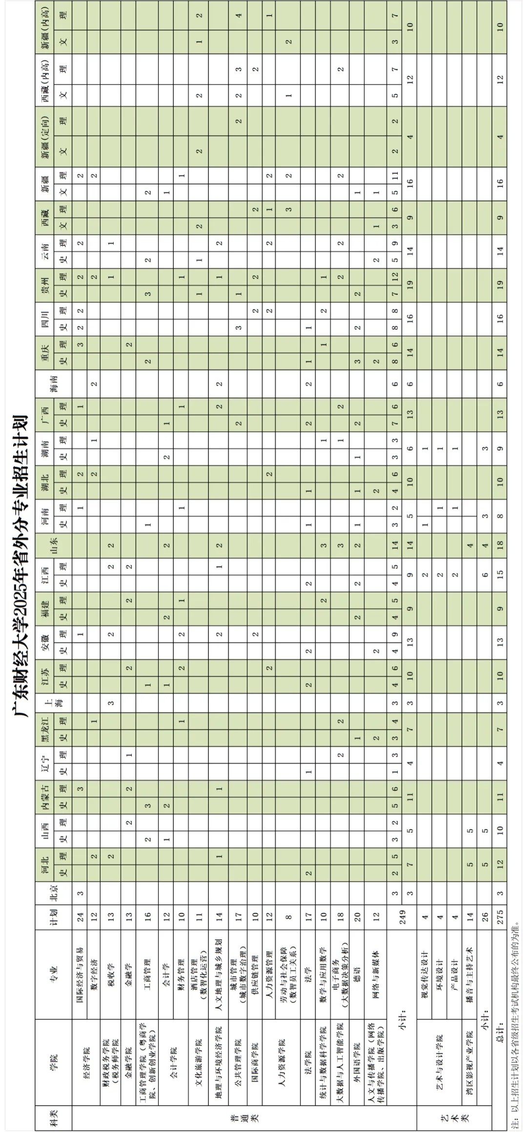 2025年学校在广东省内招生计划为5883人,其中历史类1604人,物理类3790人,艺体类459人,地方专项30人;广东省外在23个省(自治区、直辖市)招生,招生计划为275人。